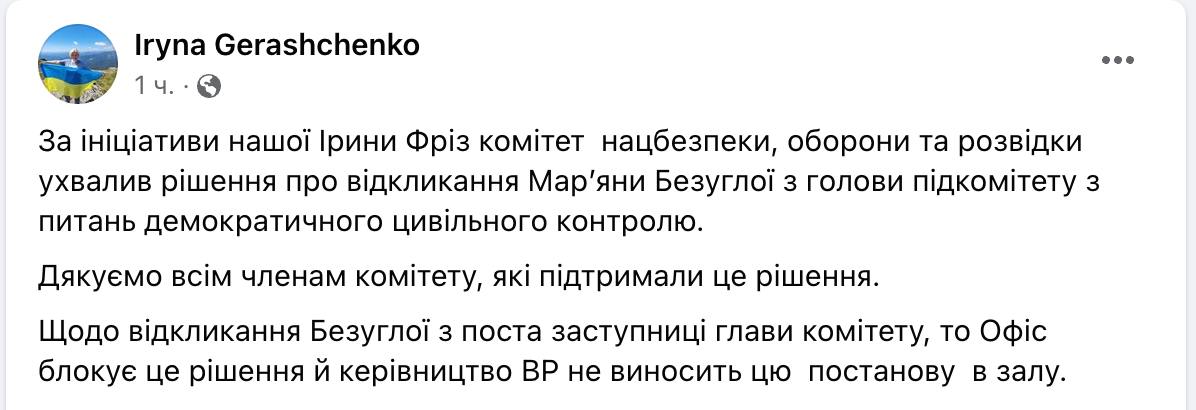 Еще раньше было проголосовано решение о снятии Безуглой с должности заместителя главы оборонного комитета, но его так и не утвердил парламент.