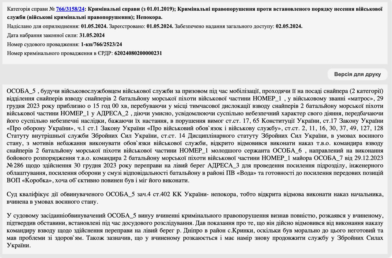 В реестре судебных решений продолжают появляться вердикты судов в отношении военнослужащих, которые отказались выполнять приказы в Крынках Херсонской области.