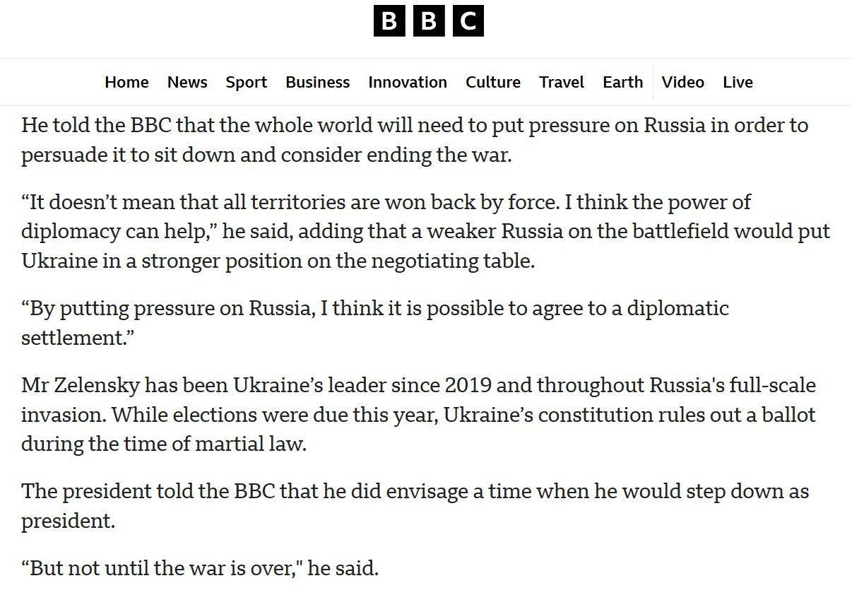 Отметим, что многие телеграм-каналы пишут о том, что Зеленский в интервью BBC заявил об окончании войны до конца года.