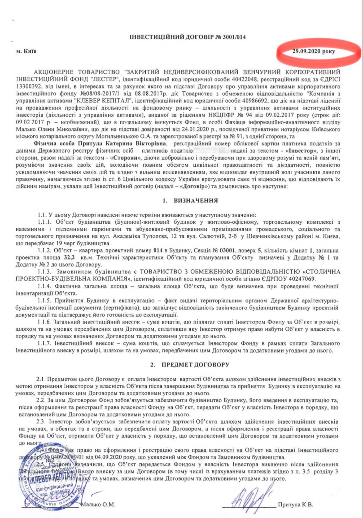Притула также опубликовал первые страницы инвестиционных договоров на три квартиры от 2020 года. Однако в них не указана сумма покупки, а также нет графика выплат по ней. То есть были ли выплачены средства за три квартиры до начала войны в Украине или вносились и после начала полномасштабного вторжения РФ, неизвестно.