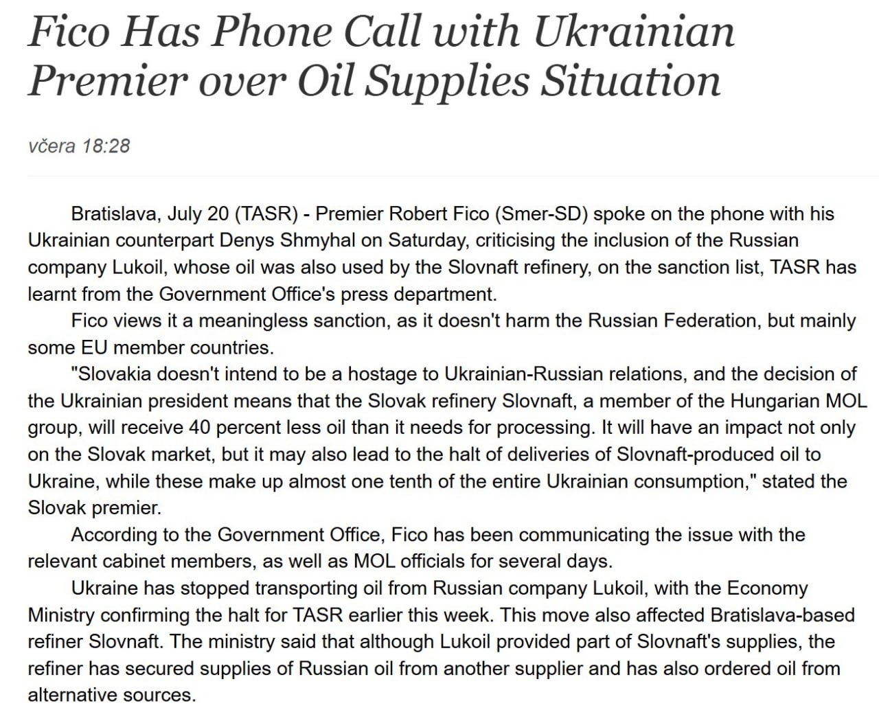 Премьер-министр Словакии Роберт Фицо раскритиковал украинские санкции против "Лукойла" и заявил, что из-за них в итоге пострадают поставки топлива Украине. Ведь нефть, которую Украина перекрыла в Словакию и Венгрию, использовалась на нефтеперерабатывающем заводе Slovnaft, который поставляет десятую часть продукции в Украину.