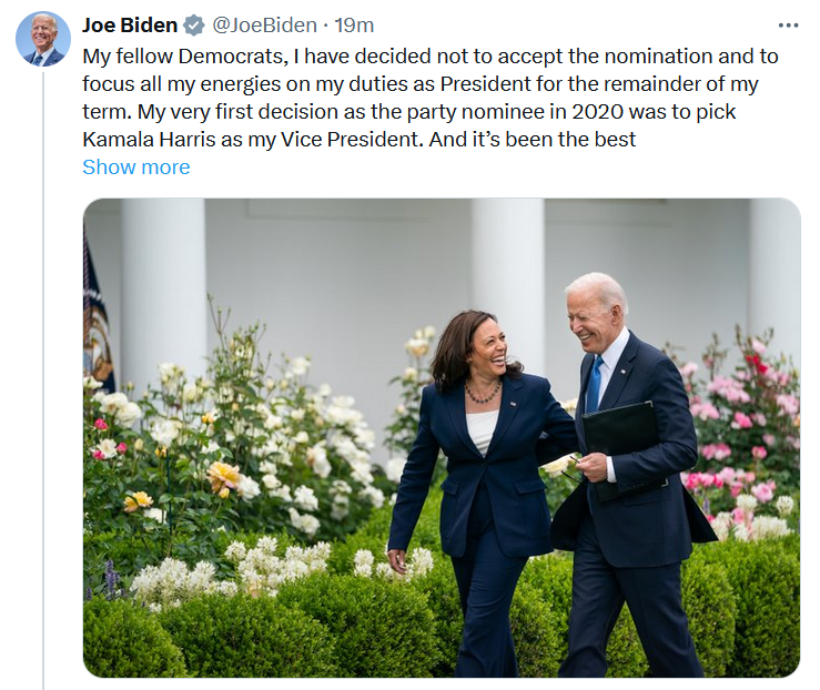 Напомним, ранее СМИ писали о том, что на этих выходных Байден объявит о снятии своей кандидатуры с выборов президента США.