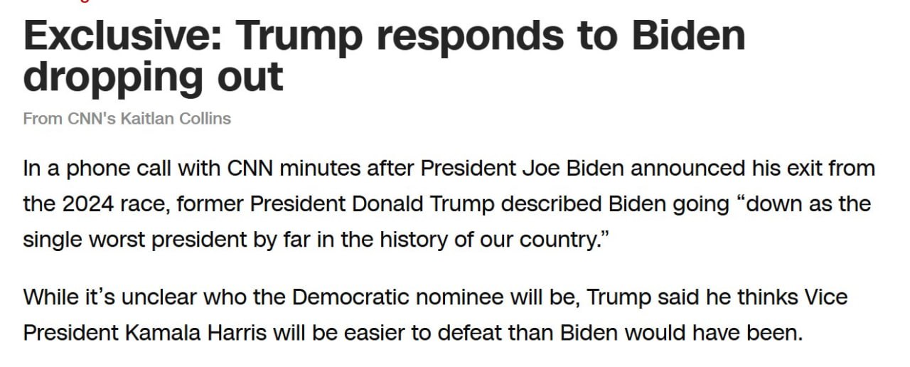 Судя по его заявлению телеканалу CNN, Трамп ждет, что выдвигаться от демократов теперь будет вице-президент Камала Харрис. Он заявил, что ее "будет легче победить, чем Байдена".