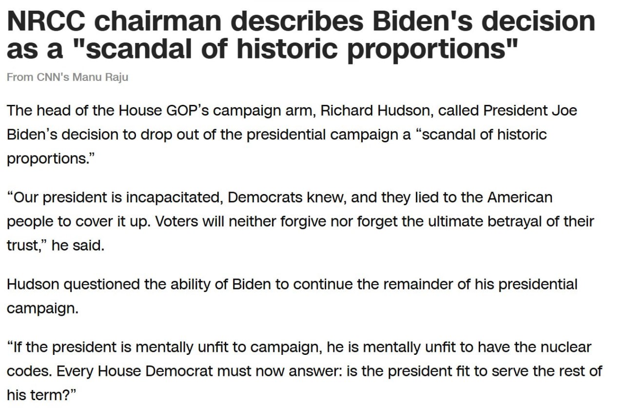 Об этом заявил глава предвыборного штаба республиканцев, конгрессмен Ричард Хадсон. Он назвал решение президента Байдена выйти из президентской кампании "скандалом исторического масштаба".