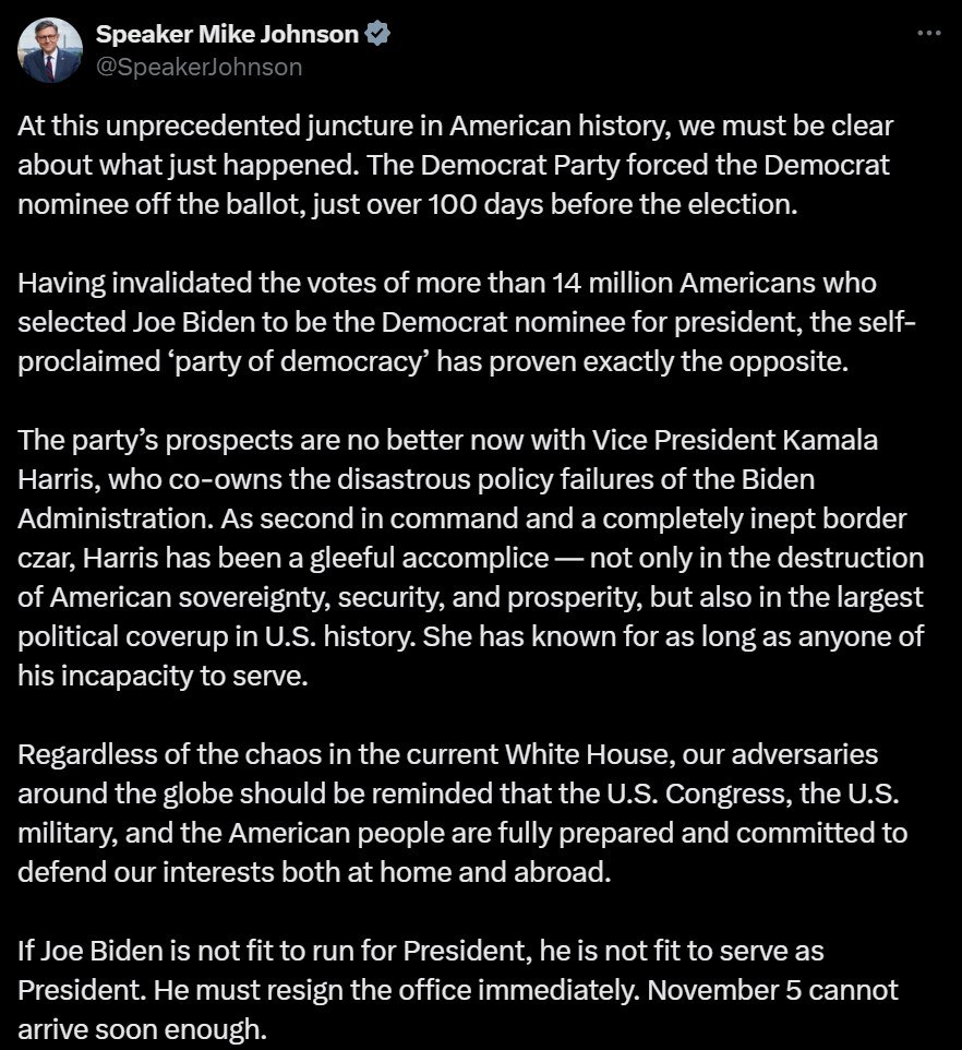 "Если Джо Байден не достоин баллотироваться на пост президента, он не достоин занимать пост президента. Он должен немедленно уйти в отставку", - написал Джонсон в соцсети Х.