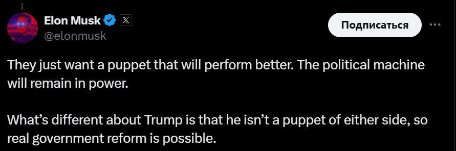 "Им (демократам - Ред.) просто нужна марионетка, которая будет работать лучше. Политическая машина останется у власти. Отличие Трампа в том, что он не является марионеткой ни одной из сторон", - заявил миллиардер, недавно поддержавший республиканца.