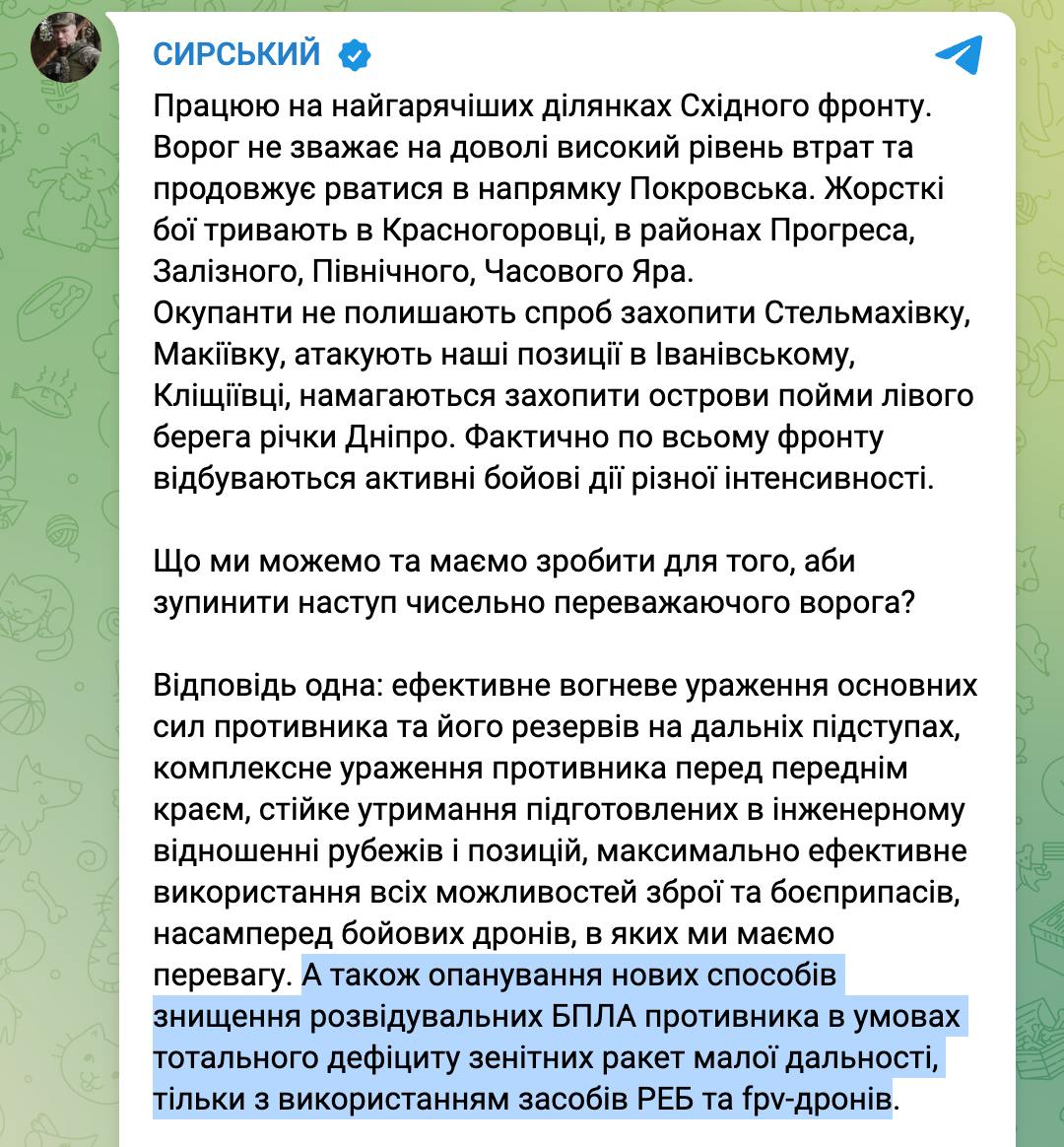 По словам Сырского, ВСУ необходимо "овладение новыми способами уничтожения разведывательных БПЛА противника в условиях тотального дефицита зенитных ракет малой дальности, только с использованием средств РЭБ и FPV-дронов".