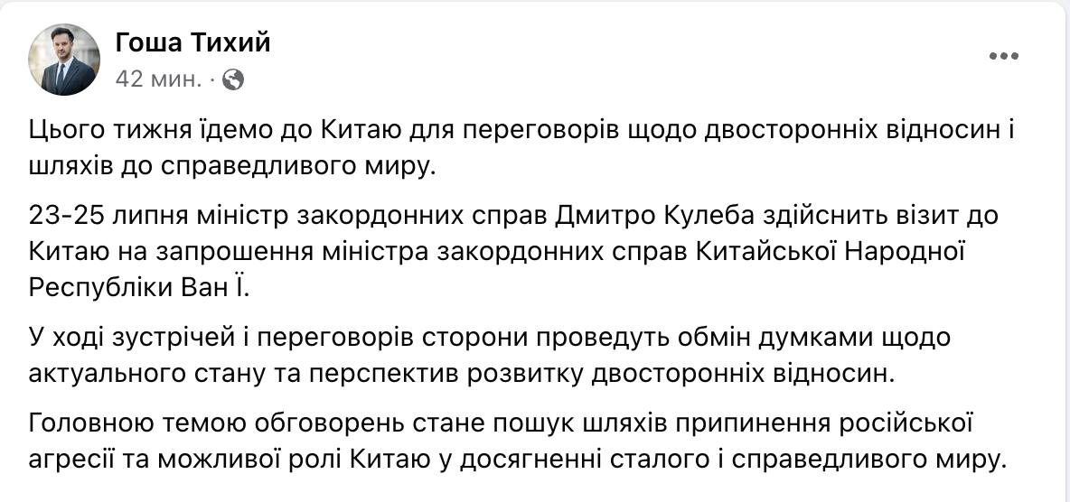 "В ходе встреч и переговоров стороны проведут обмен мнениями по актуальному состоянию и перспективам развития двусторонних отношений. Главной темой обсуждений станет поиск путей прекращения российской агрессии и возможной роли Китая в достижении устойчивого и справедливого мира", - написал Тихий.