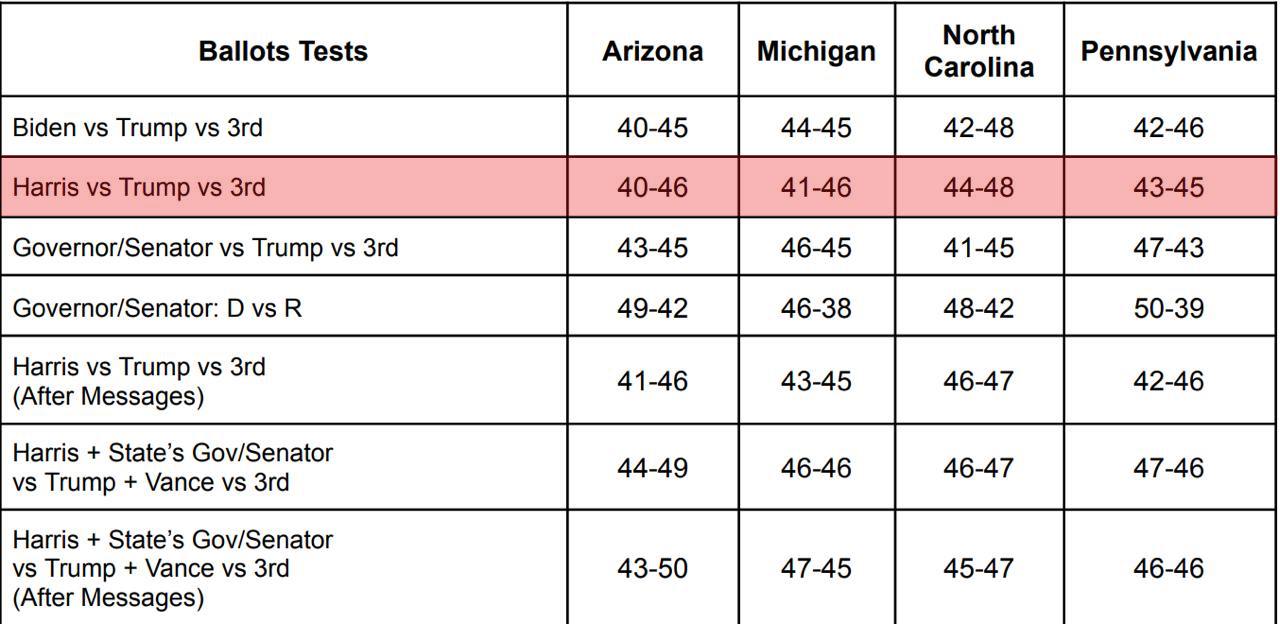 • Аризона: Трамп 46%; Харрис 40% (+6).