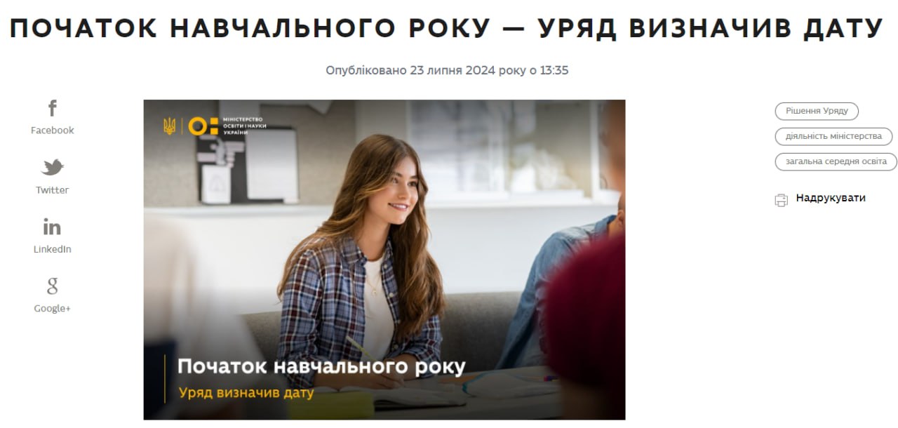 Ранее сообщалось, что Кабинет министров принял решение о том, что обучение в школах Украины в этом году начнется в понедельник, 2 сентября, и закончится 30 июня 2025 года.