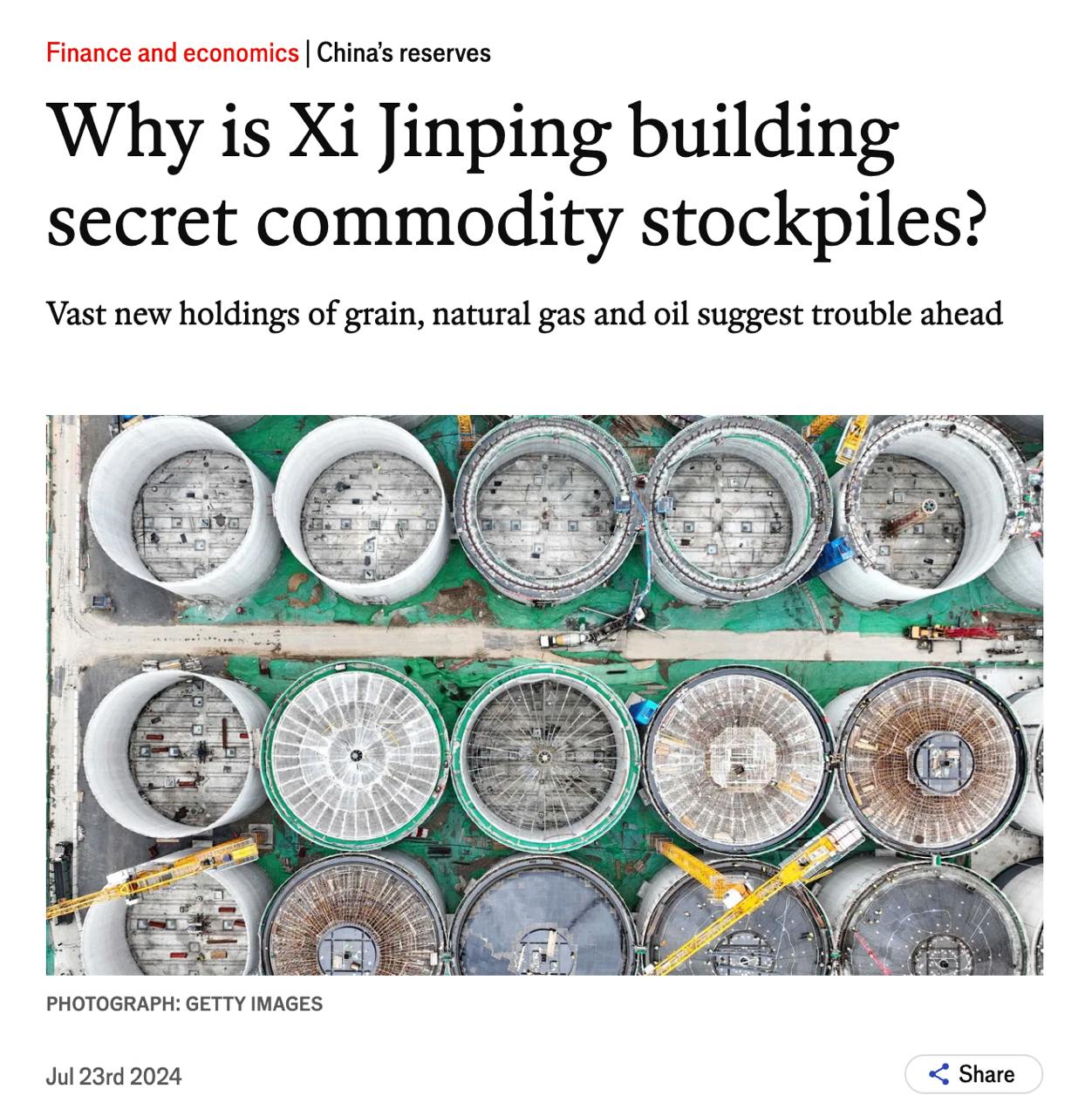 Китай импортирует большую часть необходимого сырья и продовольствия. Однако такая динамика не отражает растущее потребление, учитывая экономические трудности страны. По мнению The Economist, Пекин накапливает ресурсы, беспокоясь, что если выборы выиграет Дональд Трамп, то он может попытаться перекрыть КНР важнейшие пути поставок или начнется затяжной конфликт из-за Тайваня.