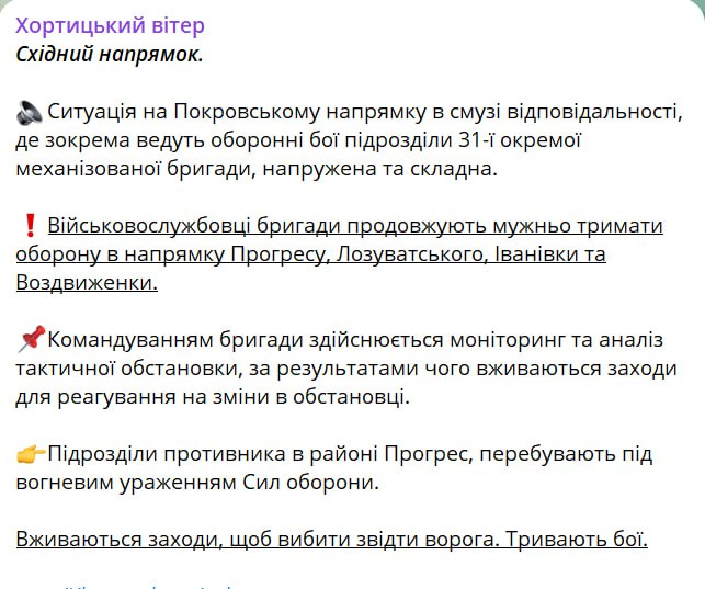Оперативно-стратегическая группировка войск "Хортица" признала потерю населенного пункта Прогресс на Покровском направлении.