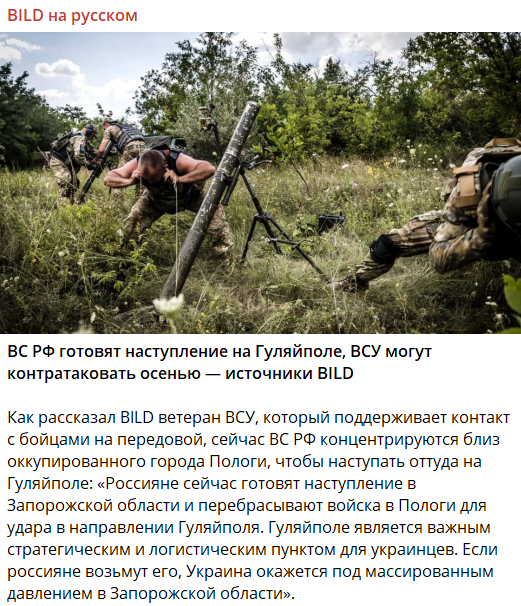 Армия РФ готовит наступление на Гуляйполе в Запорожской области. Об этом пишет немецкий таблоид Bild со ссылкой на источники среди украинских военных.
