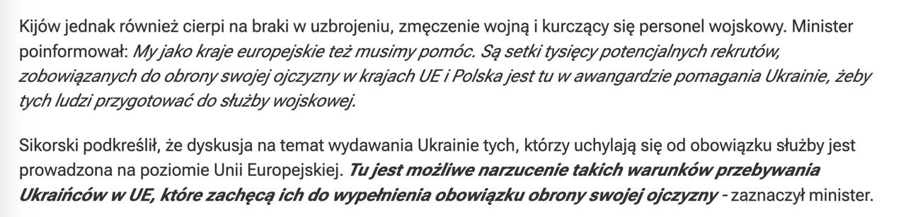 "Мы, как европейские страны, тоже должны помочь. В странах ЕС находятся сотни тысяч потенциальных призывников, обязанных защищать свою родину, и Польша находится в авангарде помощи Украине в подготовке этих людей к военной службе", - заявил министр.