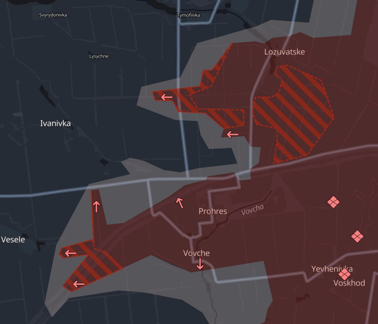 Российские войска продвинулись на Покровском направлении. Они подошли к селам Веселое, Лисичное и Тимофеевка, продвинувшись на запад от недавно захваченного Прогресса.