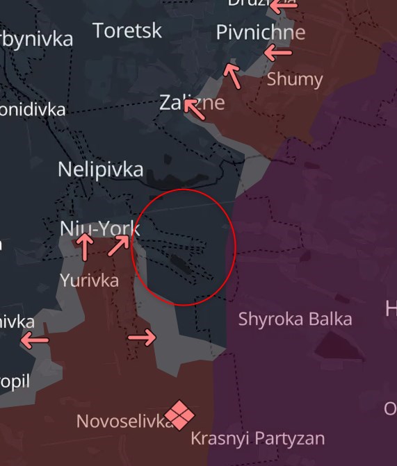 ВСУ могут попасть в котёл под Торецком, заявляет военный обозреватель Bild Юлиан Рёпке. Восточнее Нью-Йорка уже образовался выступ, а россияне продолжают наступление с юга через Нью-Йорк и с севера через Зализное.