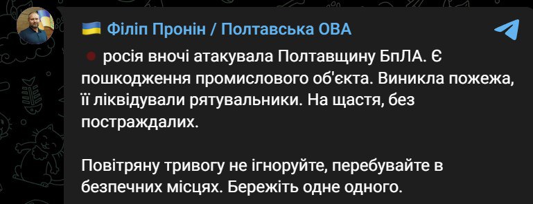09:47 Ночью беспилотники ударили по промышленному объекту в Полтавской области, заявила ОВА. Там возник пожар.