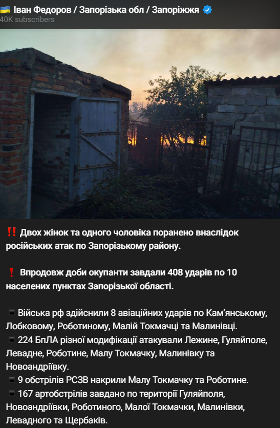 08:14 В Запорожском районе две женщины и один мужчина получили ранения в результате российских атак. За сутки оккупанты нанесли 408 ударов по 10 населенным пунктам Запорожской области.