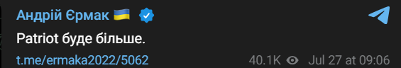 10:18 Глава Офиса президента Андрей Ермак анонсировал новые поставки систем ПВО Patriot в Украину.