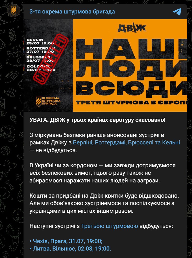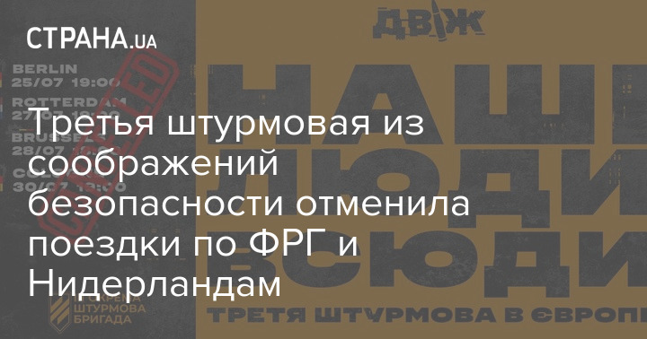 Третья штурмовая бригада отменила поездки своих ветеранов по ФРГ и Нидерландам. Они собирались провести встречи с украинцами - в Берлине, Роттердаме, Брюсселе и Кельне. Поездка отменена из соображений безопасности.