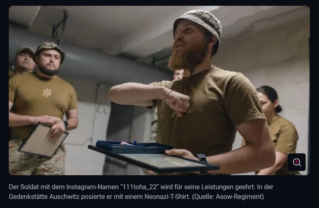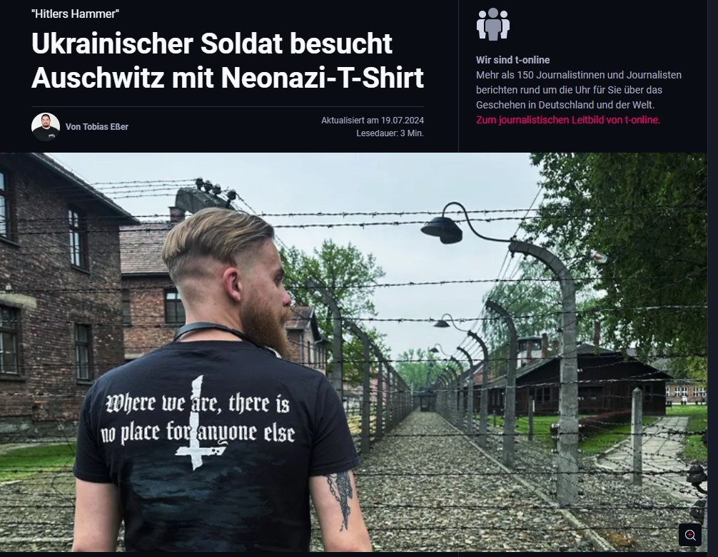 "Солдат, которого можно найти в Instagram под ником "111toha_22", посетил бывший нацистский концлагерь. Он был одет в футболку российской блэк-метал-группы M8l8th (расшифровывается это название как "Молот Гитлера", а ее основатель Левкин воюет в составе Русского добровольческого корпуса на стороне Украины - Ред.). На обороте красуется фраза "Там, где мы есть, нет места никому другому". Некоторые историки приписывают эту цитату Адольфу Гитлеру, даже если точное происхождение точно не доказано", - пишет издание t-online.