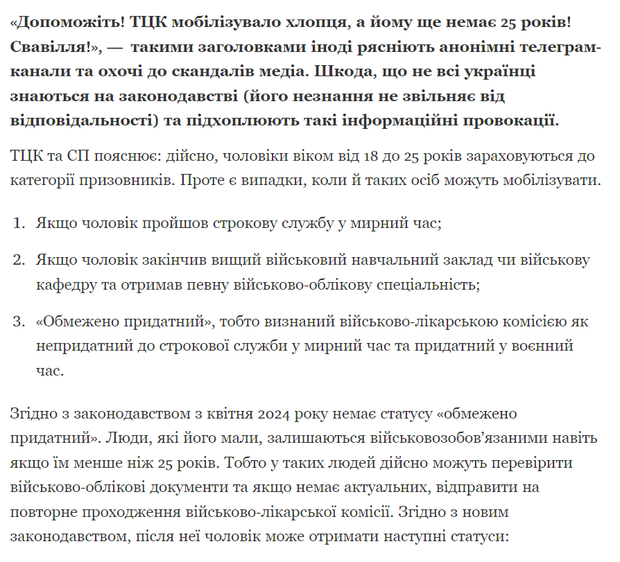 В ТЦК отмечают, что согласно законодательству, с апреля 2024 года нет статуса "ограниченно пригодный". Имевшие его люди остаются военнообязанными и могут быть мобилизованы даже если им меньше 25 лет.
