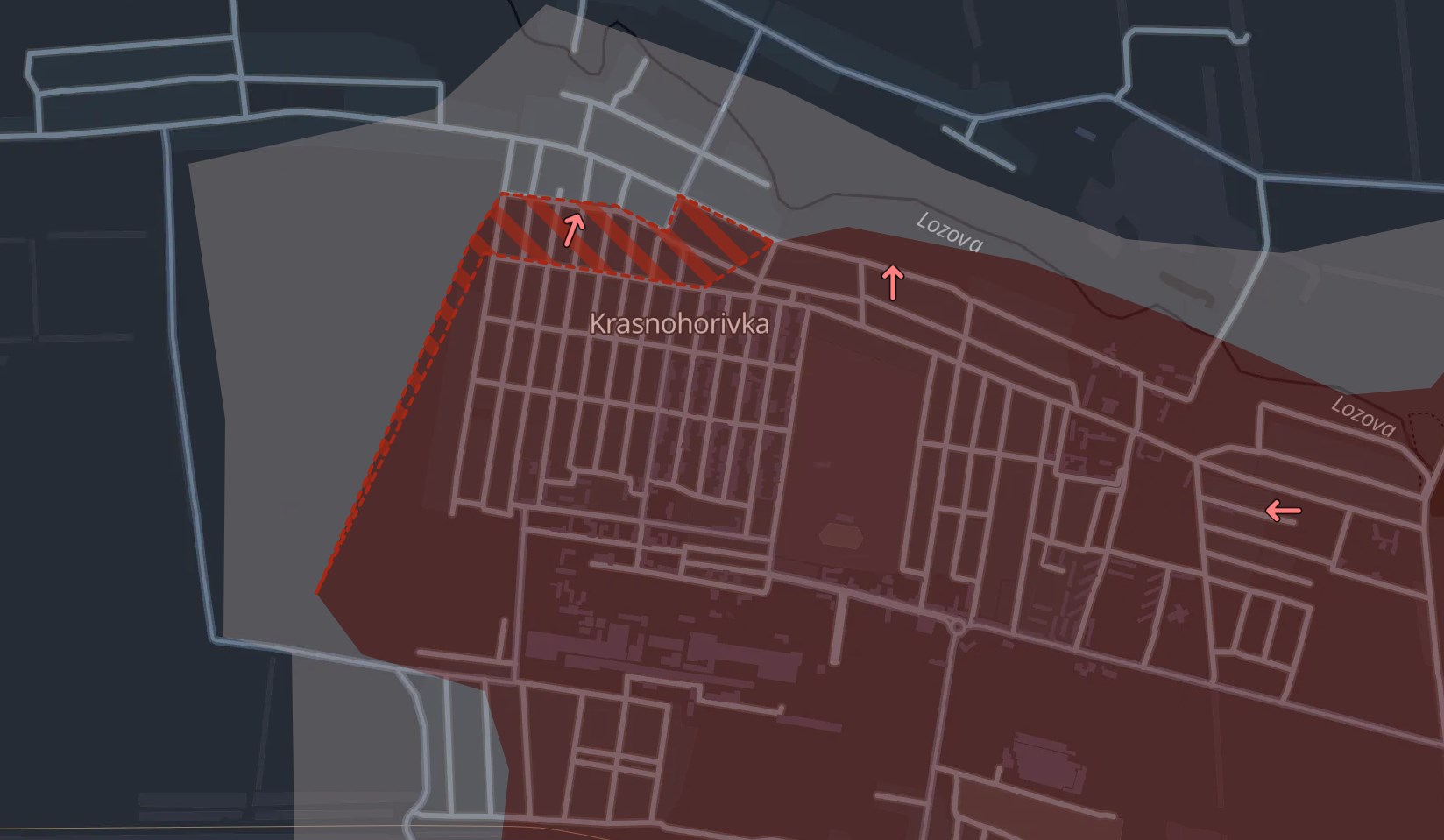 Очередное продвижение РФ и на северных окраинах Красногоровки. Большая часть территории города, судя по карте Deep State, находится уже под контролем россиян.
