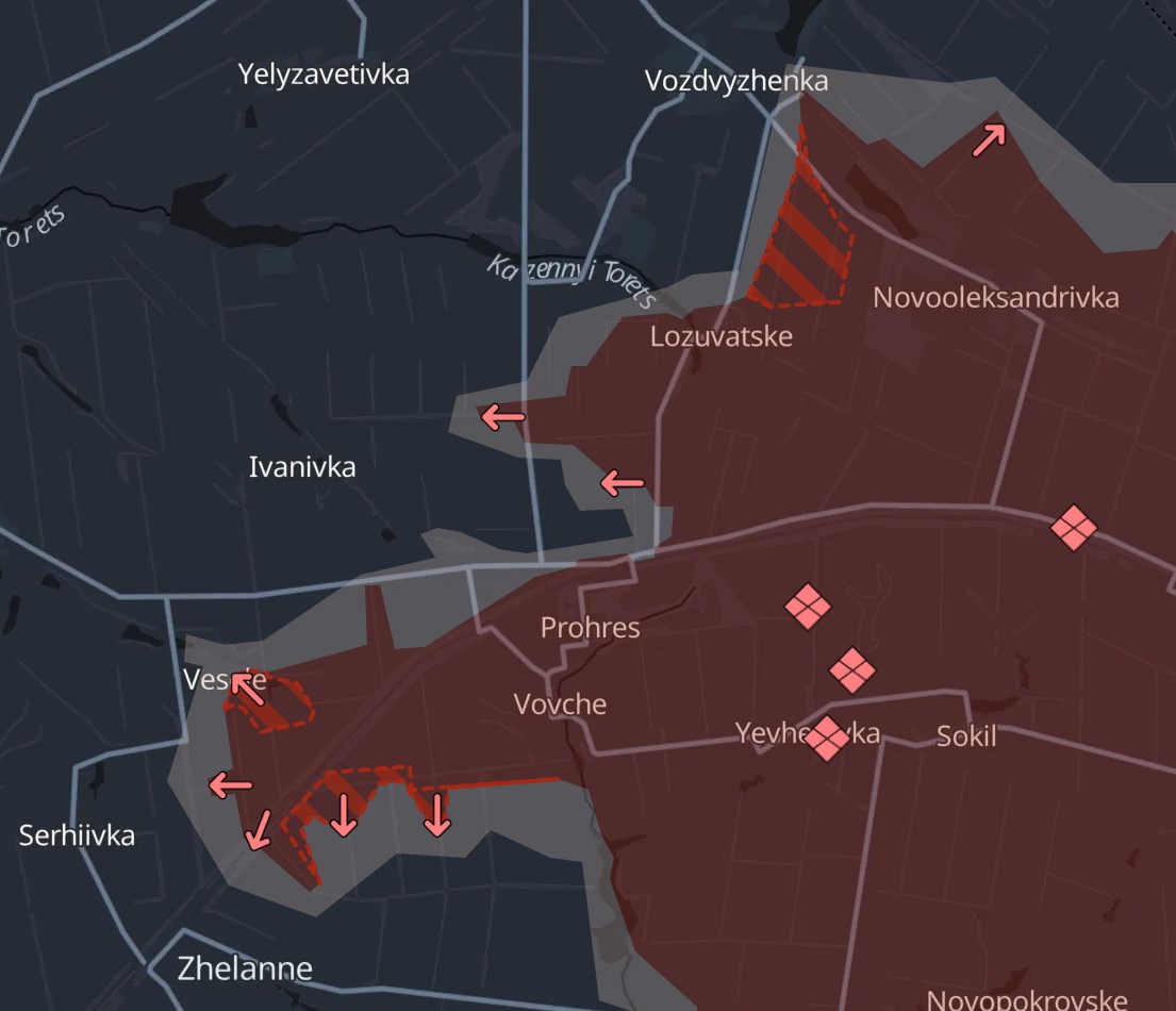Паблик Deep State пишет, что россияне продвинулись на Покровском участке за сутки в трех местах - в сторону Воздвиженки (через которую можно выйти на трассу Покровск - Константиновка), в селе Веселом и возле Желанного.