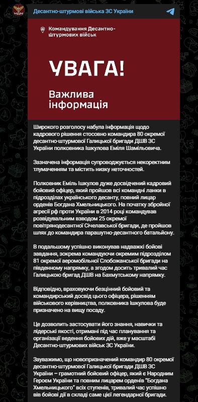 "Учитывая бесценный боевой и командирский опыт этого офицера, решением военного руководства полковник Ишкулов будет назначен на высшую должность. Это позволит применить его знания, навыки и лидерские качества, полученные при планировании и организации ведения боевых действий, уже в масштабе Десантно-штурмовых войск ВС Украины", - заявили в ДШВ.