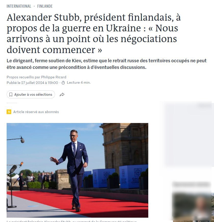 10.41 Президент Финляндии Стубб заявил, что Украине нужно провести переговоры с Россией, не дожидаясь освобождения территорий.