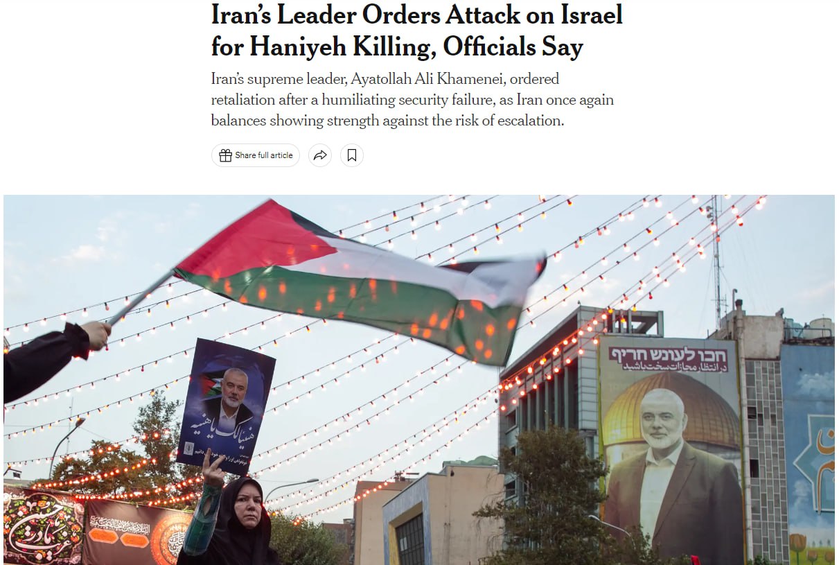 По данным издания, соответствующее распоряжение Хаменеи дал на экстренном заседании Верховного совета национальной безопасности Ирана утром 31 июля.