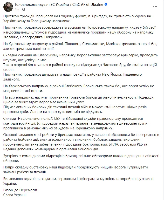 При этом он подтвердил, что россияне заходят в Торецк. Он пишет, что "диверсионные группы противника обнаруживают и обезвреживают в районах городской застройки на Торецком направлении".