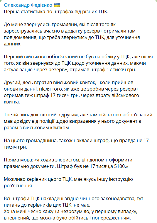 "Первый военнообязанный не был на учете в ТЦК, но после того, как он обратился в ТЦК по уточнению данных, имея актуализацию через резерв+, получил штраф 17 тысяч грн.