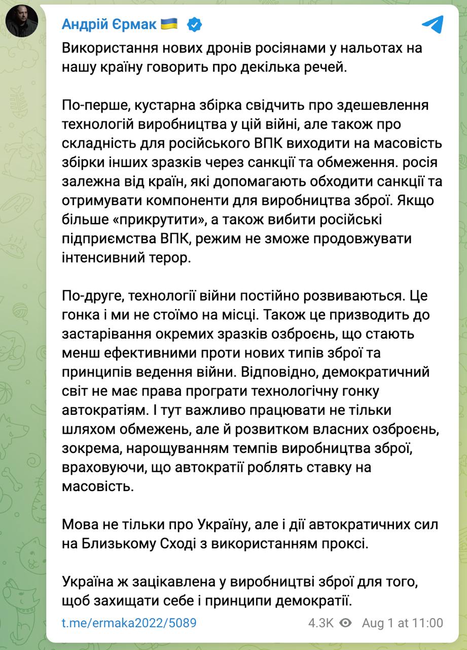11:08 Глава ОП Андрей Ермак подтвердил, что Россия начала использовать новые дроны.