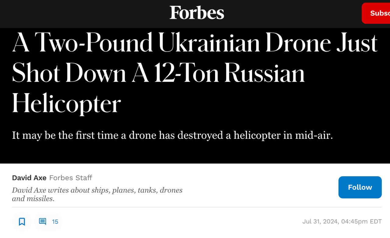 12:03 Вероятно, ВСУ вчера впервые удалось сбить российский вертолет в воздухе с помощью дрона, пишет Forbes.