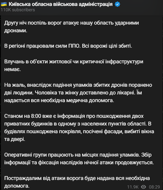 "К сожалению, в результате падения обломков сбитых дронов ранены два человека. Мужчина и женщина доставлены в больницу. Им оказывается вся необходимая медицинская помощь", - сообщает ОВА.