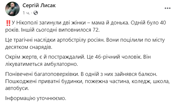 "В Никополе погибли две женщины – мама и дочь. Одной было 40 лет. Другой сегодня исполнилось 72", - написал он.