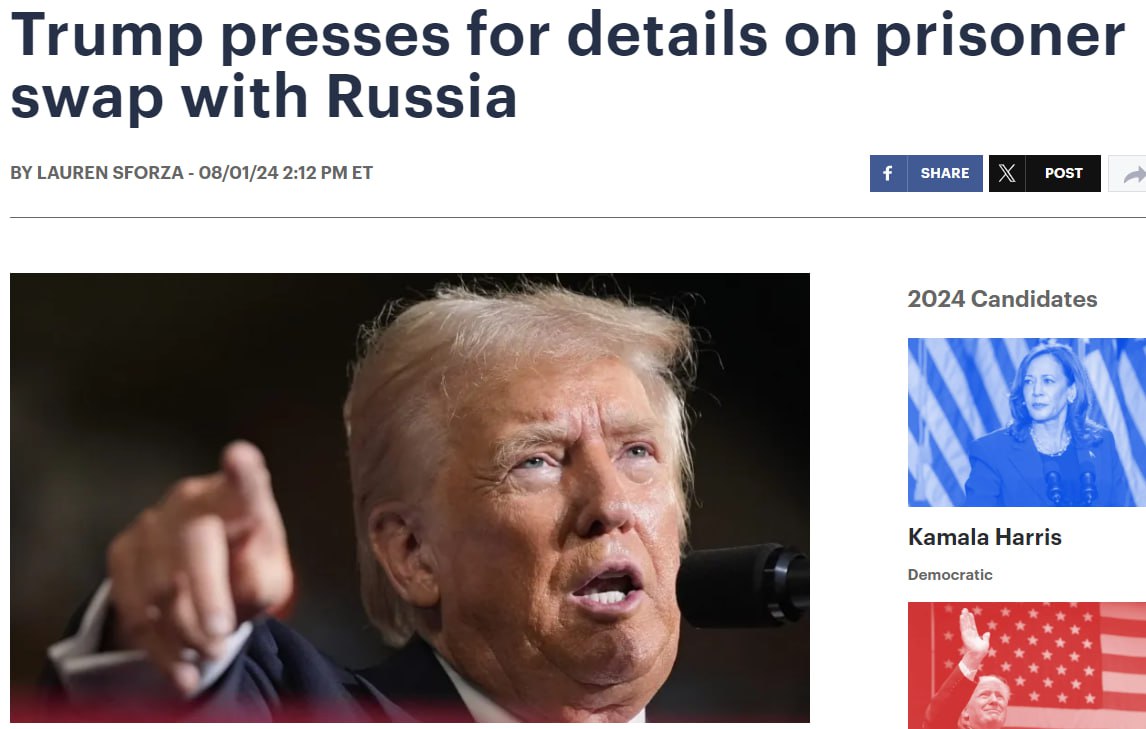 Кандидат в президенты США Дональд Трамп подозревает, что американские власти заплатили России за организацию большого обмена заключенными, который состоялся сегодня в Анкаре.