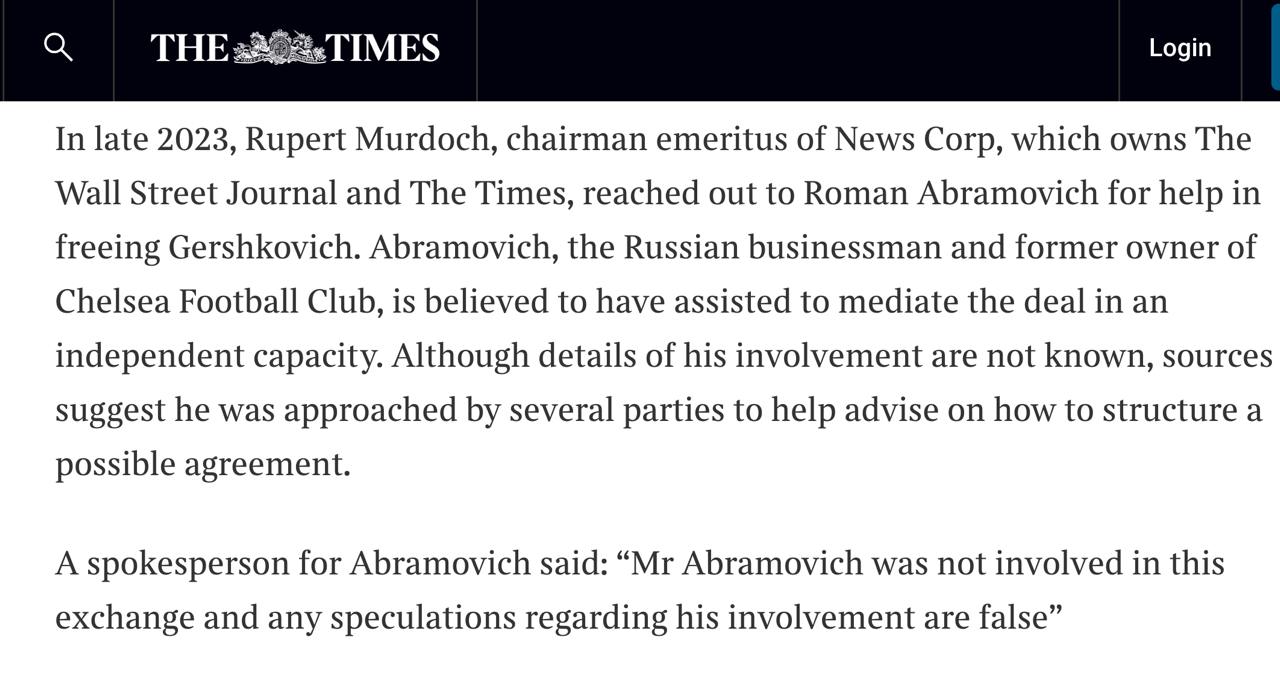 По данным издания, в конце 2023 года Мердок обратился к Абрамовичу за помощью в освобождении арестованного в России американского журналиста Эвана Гершковича. Считается, что Абрамович помогал заключению сделки в качестве независимого посредника.