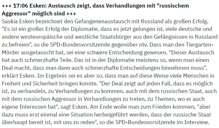 Тем временем лидер Социал-демократической партии Германии Саския Эскен в интервью ntv заявила, что обмен заключенными между Россией, Германией и США свидетельствует о том, что с Москвой можно вести переговоры.