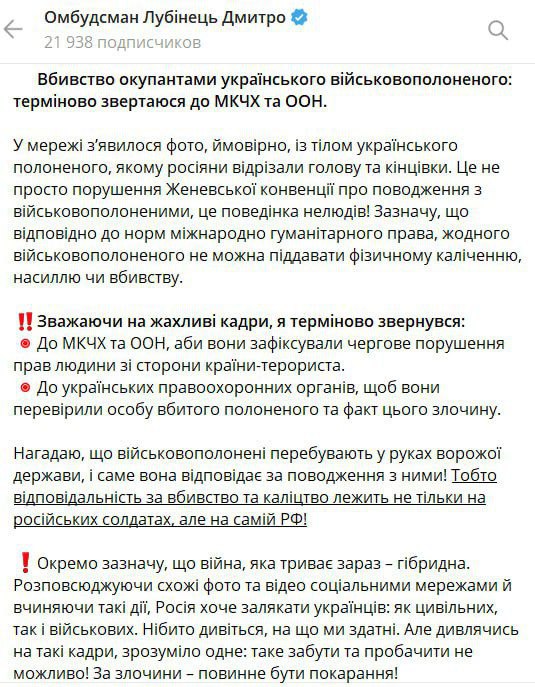 19.31 Омбудсмен Дмитрий Лубинец заявляет, что российские военные, вероятно, расчленили находившегося в плену украинца.