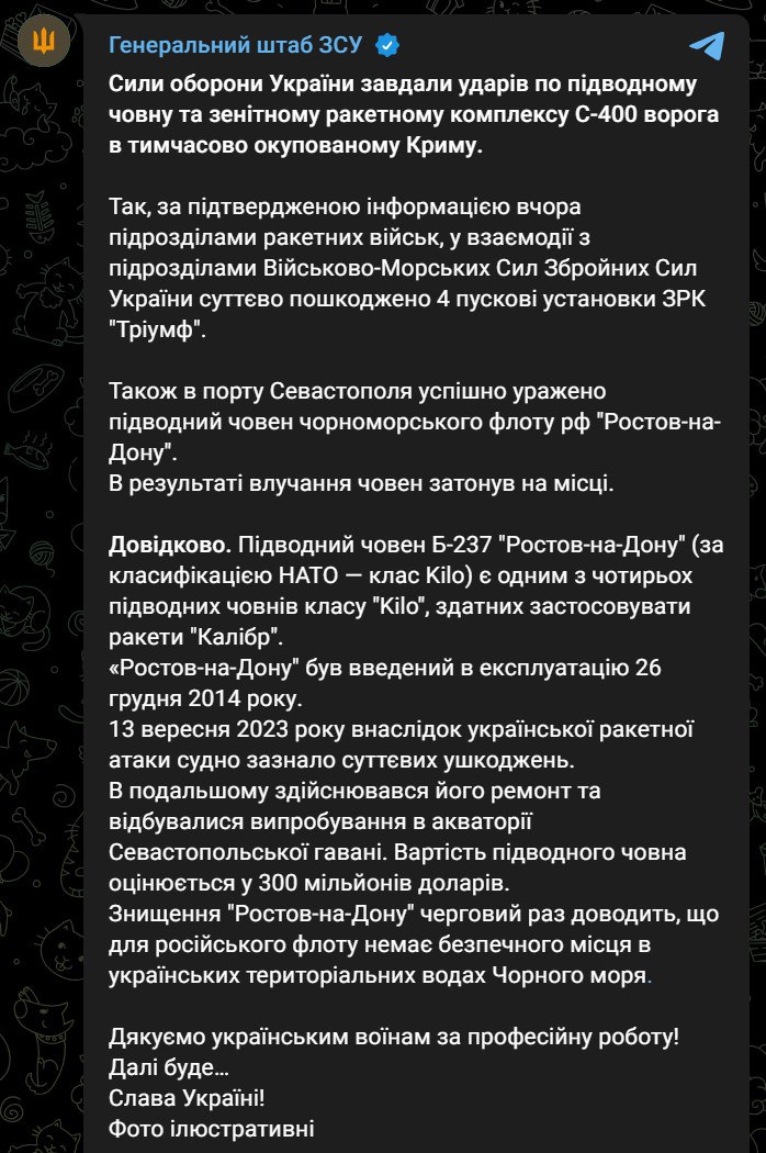Ведомство заявляет, что была поражена подводная лодка "Ростов-на-Дону", которая затонула на месте. А также, что были "существенно повреждены" четыре пусковые установки ЗРК "Триумф".