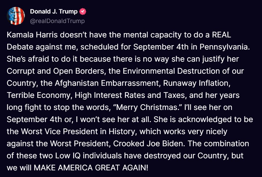 Он также добавил, что "у Камалы Харрис нет умственных способностей, чтобы провести реальные дебаты против меня, запланированные на 4 сентября в Пенсильвании".