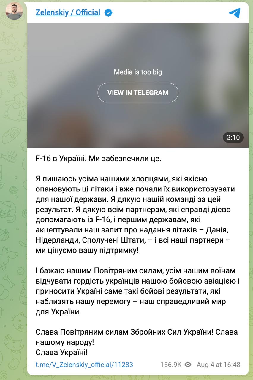"F-16 в Украине. Мы обеспечили это. Я горжусь всеми нашими ребятами, которые качественно овладевают этими самолетами и уже начали их использовать для нашего государства. Я благодарю нашу команду за этот результат. Я благодарю всех партнеров, которые по-настоящему действенно помогают с F-16, и первым государствам, которые акцептовали наш запрос о предоставлении самолетов – Дания, Нидерланды, Соединенные Штаты – и все наши партнеры – мы ценим вашу поддержку!" - написал президент.