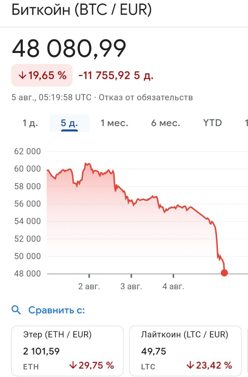 Если считать за последнюю неделю, то биткоин обрушился на 19,6%, эфир почти на 30%.
