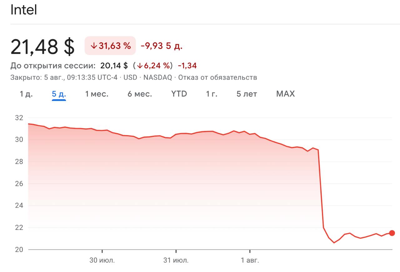 Между тем акции компании Intel на фоне падения мирового фондового рынка обрушились на 30% и продолжают падать.