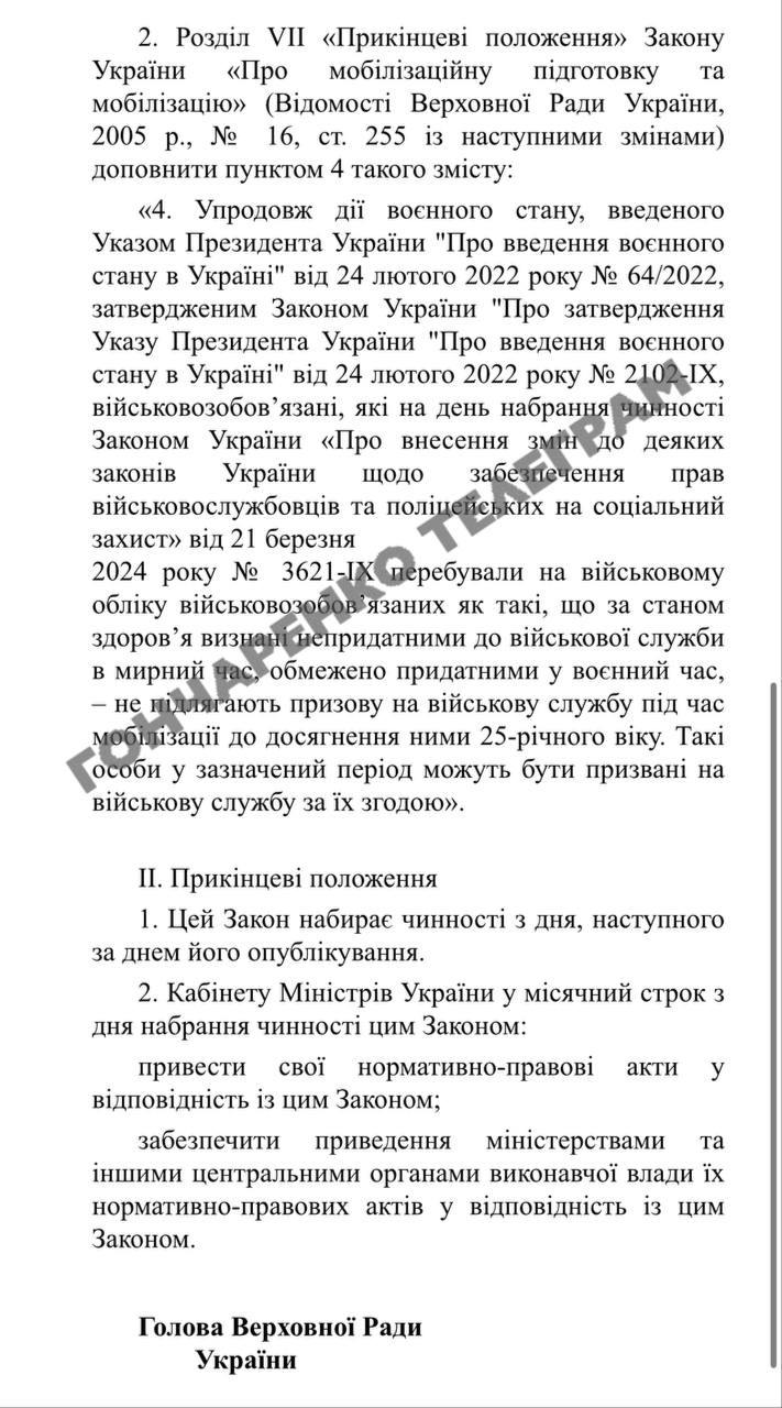 Комитет Верховной Рады Украины по вопросам национальной безопасности, обороны и разведки поддержал законопроект № 11379-д, который запрещает мобилизацию молодых мужчин младше 25 лет.
