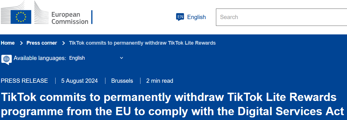 Расследование по запуску TikTok Lite во Франции и Испании началось в апреле 2024 года. В этой версии приложения пользователи могут зарабатывать баллы за просмотр видео, лайки, подписку, приглашение друзей присоединиться к TikTok и т.д. Их можно обменять на сертификаты Amazon или цифровую валюту TikTok для подарков авторам.