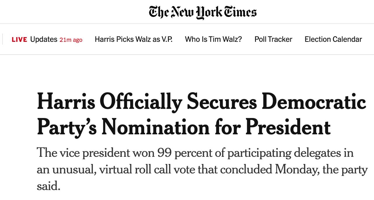 Харрис получила 99% голосов делегатов съезда партии в ходе виртуального поименного голосования.