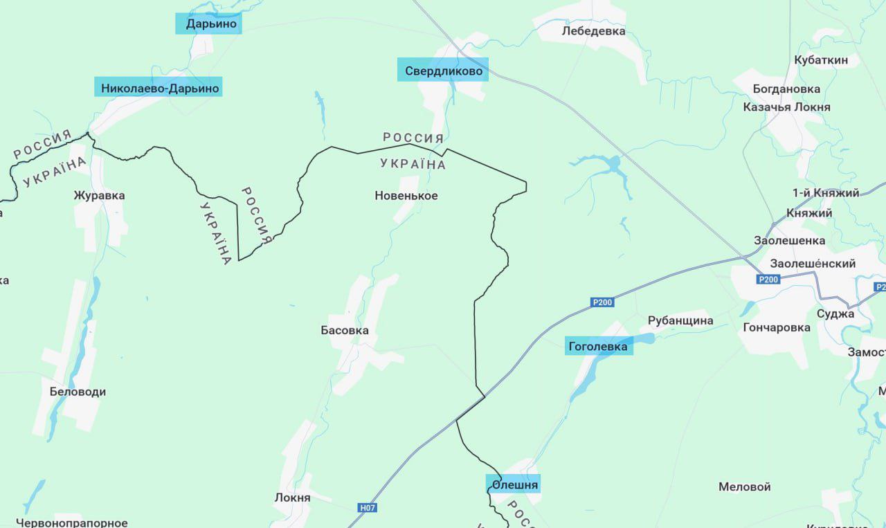 Российские военные паблики пишут, что ВСУ в ходе ночных атак закрепились в районах приграничных сел Николаево-Дарьино, Дарьино, Свердликово, Гоголевка и Олешня (на карте). Максимальная глубина - в пределах 4 километров от границы Украины.